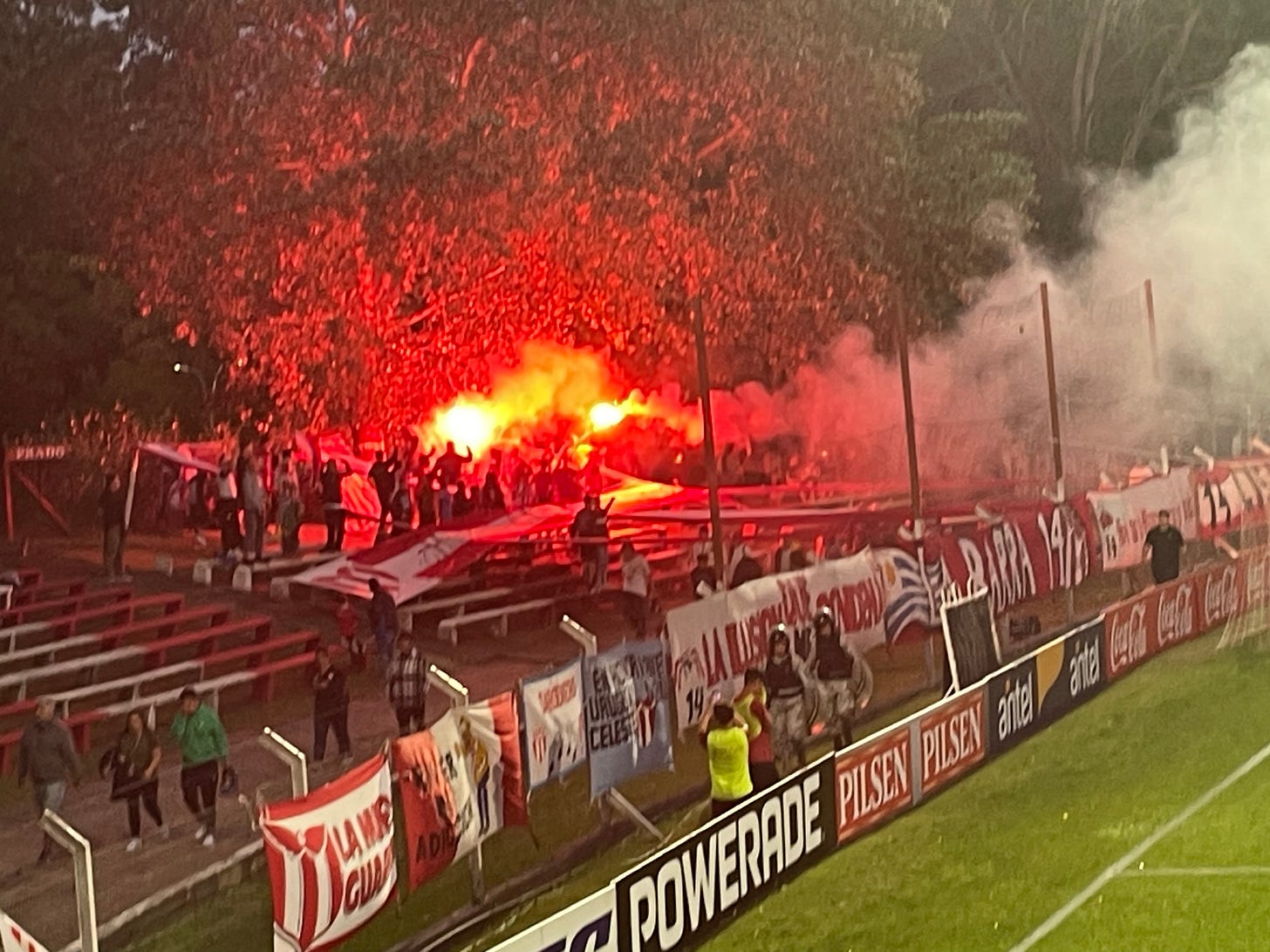 I sat in the corner of the main home platea (side stand), while behind the goal to my left, a small River Plate barra (hardcore) flapped their tirantes (large ribbons) and set off flares. They were drowned out by the huge Peñarol support opposite and were eventually silenced after the visiting Carboneros (Coalmen) took a late lead, which they ultimately defended.